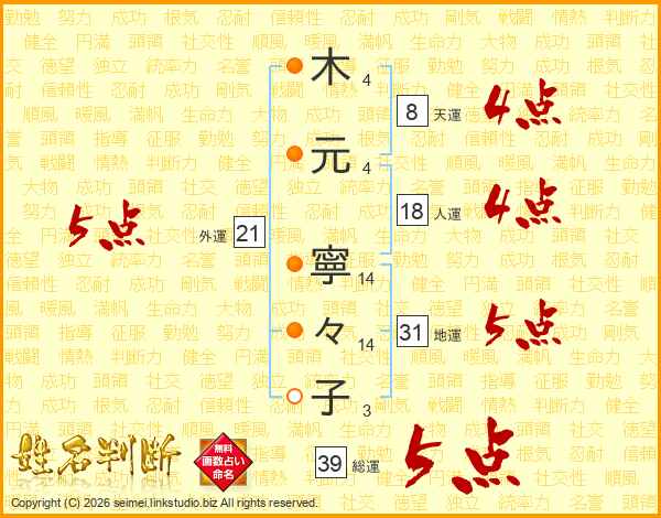木(4画)元(4画) 寧(14画)々(14画)子(3画)