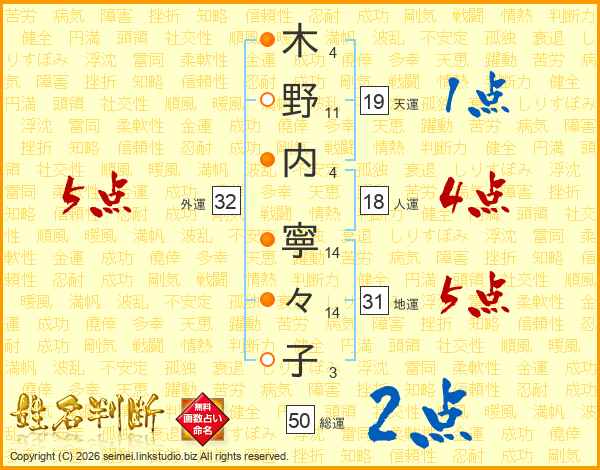 木(4画)野(11画)内(4画) 寧(14画)々(14画)子(3画)