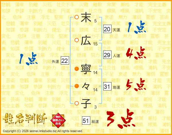 末(5画)広(15画) 寧(14画)々(14画)子(3画)