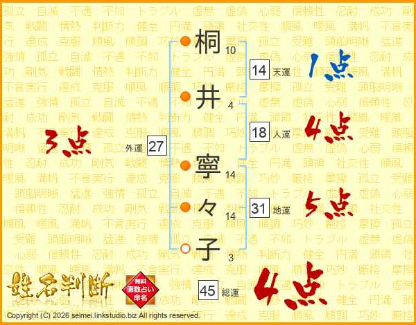 桐(10画)井(4画) 寧(14画)々(14画)子(3画)