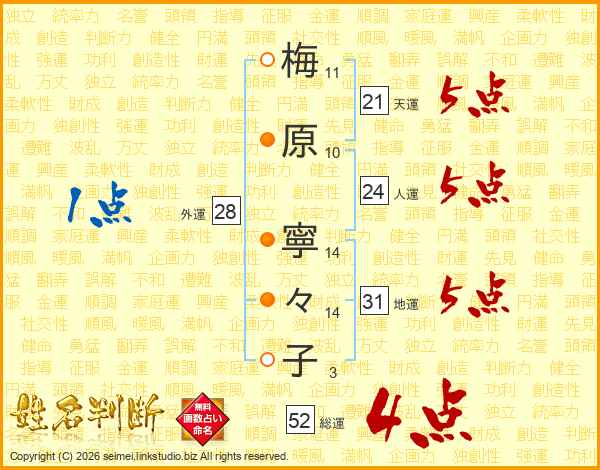 梅(11画)原(10画) 寧(14画)々(14画)子(3画)