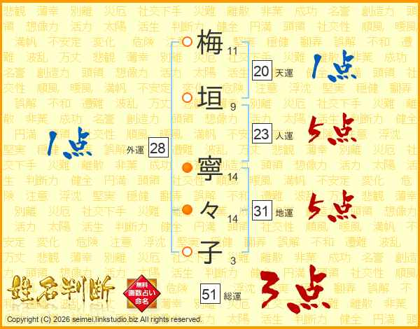 梅(11画)垣(9画) 寧(14画)々(14画)子(3画)