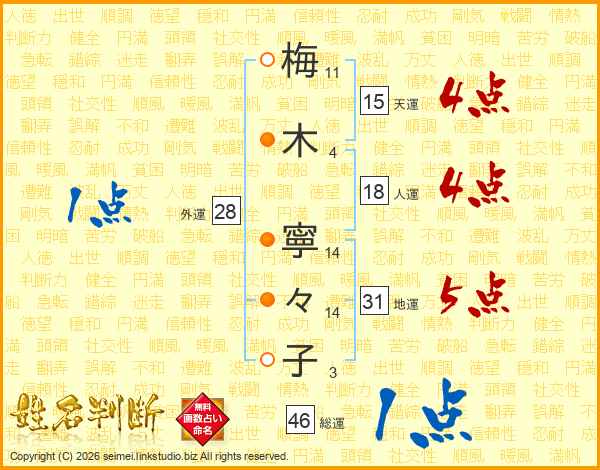 梅(11画)木(4画) 寧(14画)々(14画)子(3画)
