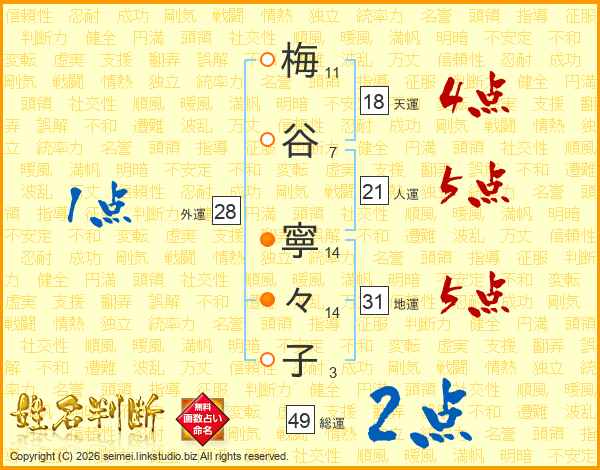 梅(11画)谷(7画) 寧(14画)々(14画)子(3画)