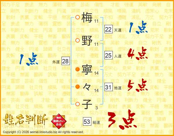 梅(11画)野(11画) 寧(14画)々(14画)子(3画)