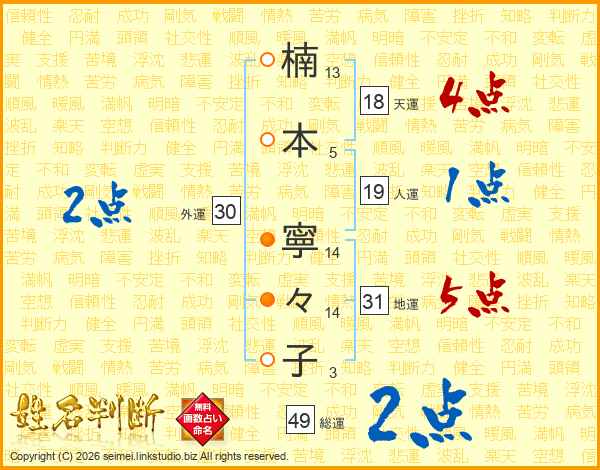 楠(13画)本(5画) 寧(14画)々(14画)子(3画)