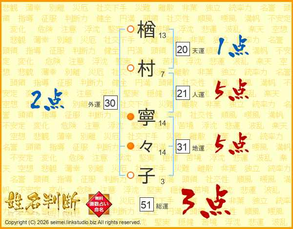 楢(13画)村(7画) 寧(14画)々(14画)子(3画)