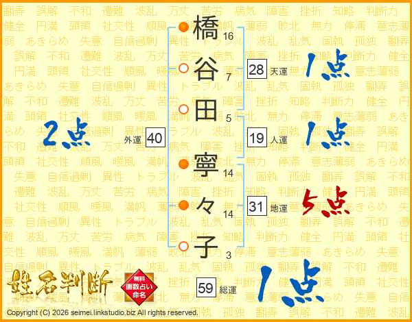 橋(16画)谷(7画)田(5画) 寧(14画)々(14画)子(3画)