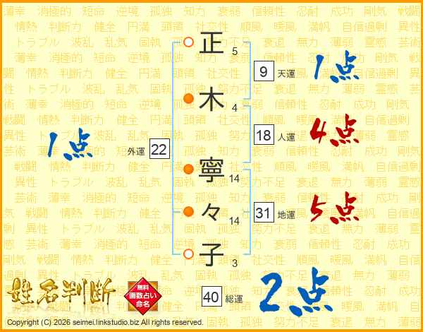 正(5画)木(4画) 寧(14画)々(14画)子(3画)