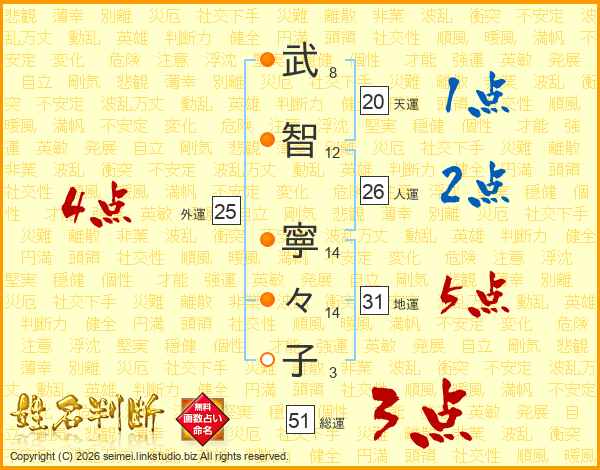 武(8画)智(12画) 寧(14画)々(14画)子(3画)