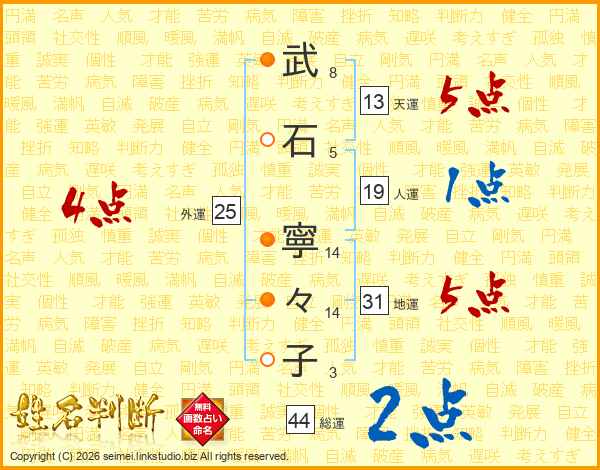 武(8画)石(5画) 寧(14画)々(14画)子(3画)