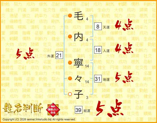 毛(4画)内(4画) 寧(14画)々(14画)子(3画)