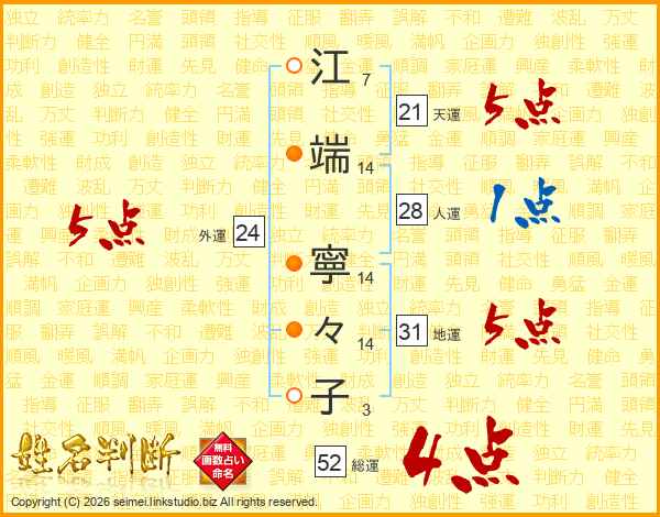 江(7画)端(14画) 寧(14画)々(14画)子(3画)