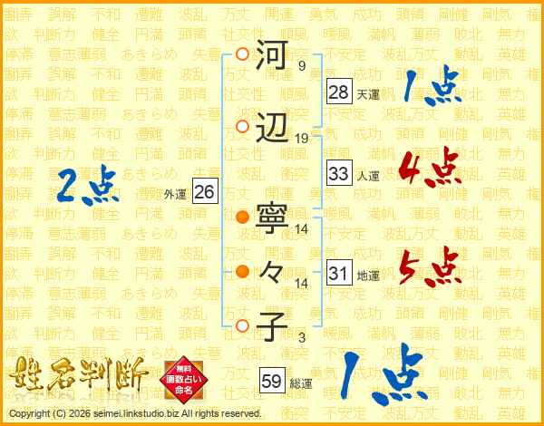 河(9画)辺(19画) 寧(14画)々(14画)子(3画)