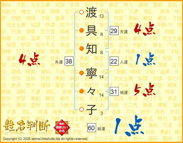 渡(13画)具(8画)知(8画) 寧(14画)々(14画)子(3画)