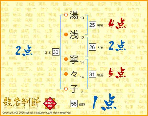 湯(13画)浅(12画) 寧(14画)々(14画)子(3画)