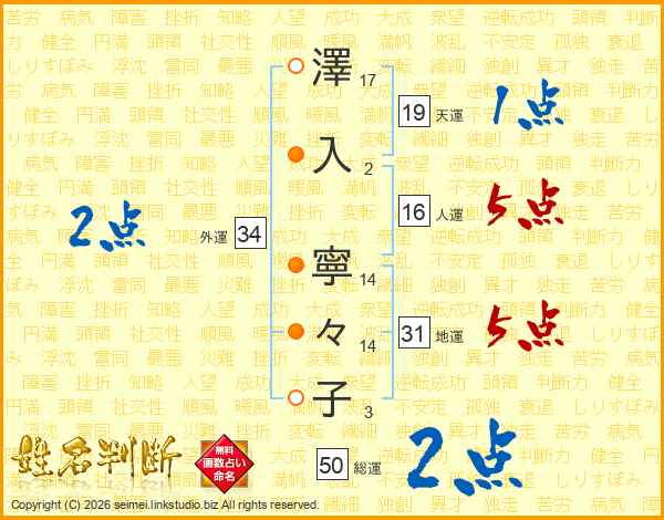澤(17画)入(2画) 寧(14画)々(14画)子(3画)