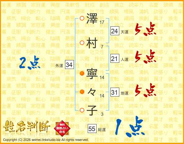 澤(17画)村(7画) 寧(14画)々(14画)子(3画)