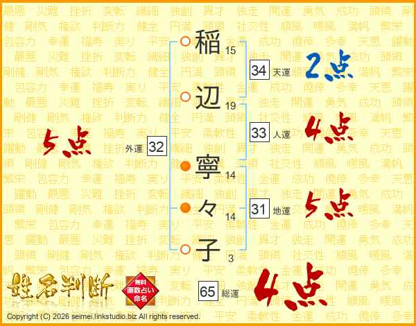 稲(15画)辺(19画) 寧(14画)々(14画)子(3画)