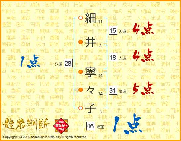 細(11画)井(4画) 寧(14画)々(14画)子(3画)