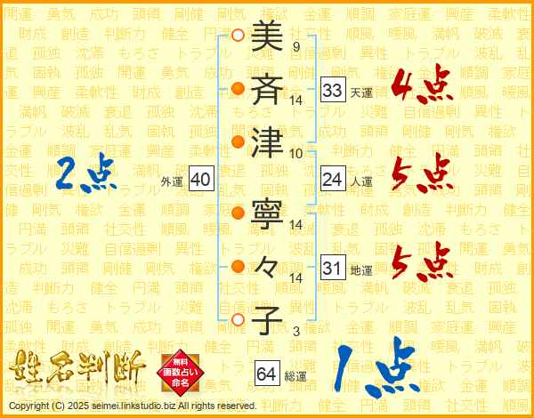 美(9画)斉(14画)津(10画) 寧(14画)々(14画)子(3画)