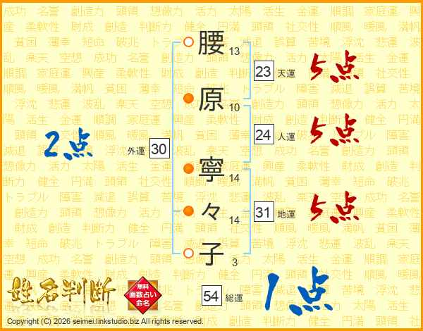 腰(13画)原(10画) 寧(14画)々(14画)子(3画)