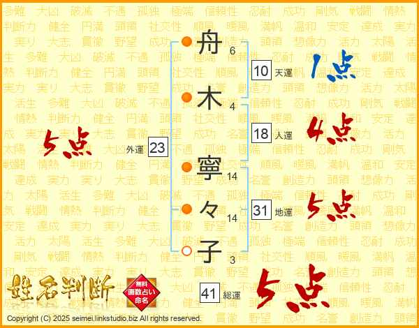 舟(6画)木(4画) 寧(14画)々(14画)子(3画)