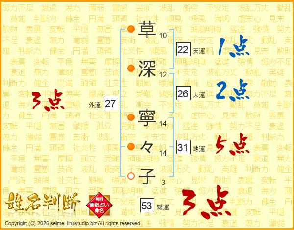 草(10画)深(12画) 寧(14画)々(14画)子(3画)