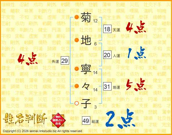 菊(12画)地(6画) 寧(14画)々(14画)子(3画)