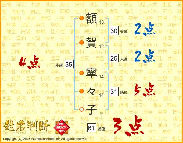 額(18画)賀(12画) 寧(14画)々(14画)子(3画)