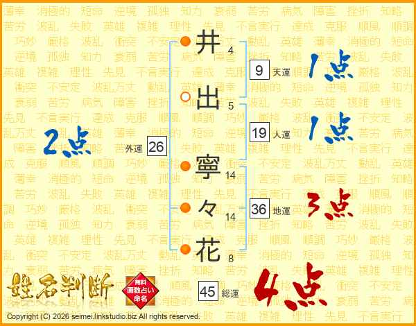 井(4画)出(5画) 寧(14画)々(14画)花(8画)