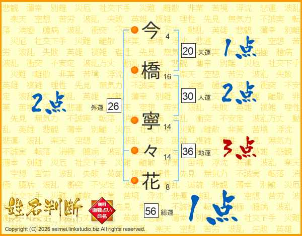 今(4画)橋(16画) 寧(14画)々(14画)花(8画)