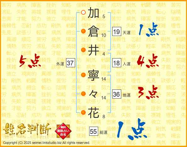 加(5画)倉(10画)井(4画) 寧(14画)々(14画)花(8画)