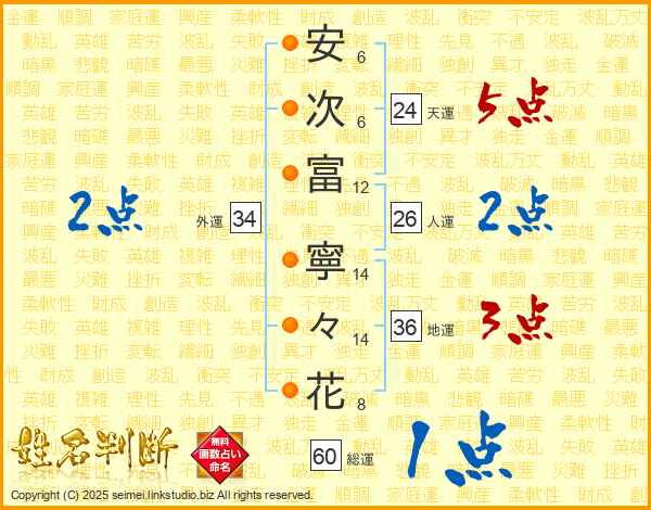 安(6画)次(6画)富(12画) 寧(14画)々(14画)花(8画)