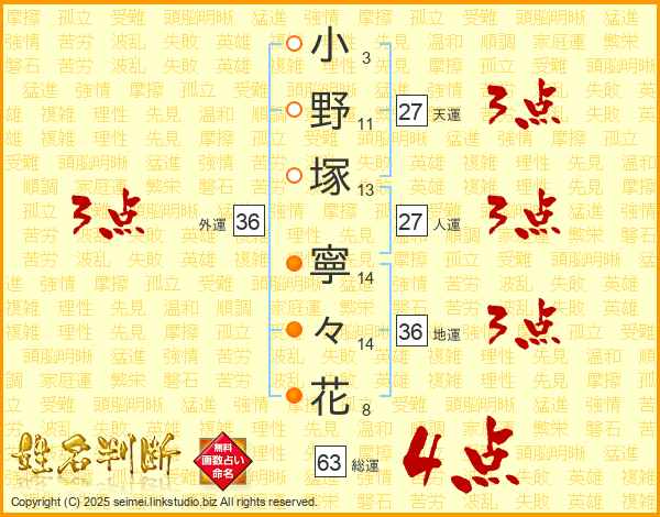 小(3画)野(11画)塚(13画) 寧(14画)々(14画)花(8画)