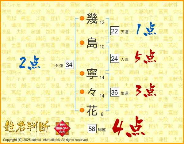 幾(12画)島(10画) 寧(14画)々(14画)花(8画)