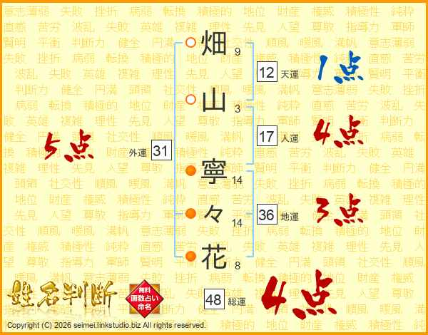 畑(9画)山(3画) 寧(14画)々(14画)花(8画)
