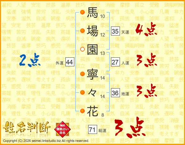 馬(10画)場(12画)園(13画) 寧(14画)々(14画)花(8画)