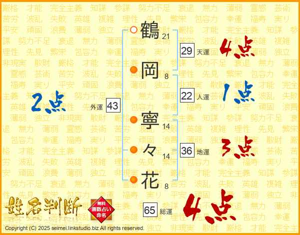 鶴(21画)岡(8画) 寧(14画)々(14画)花(8画)