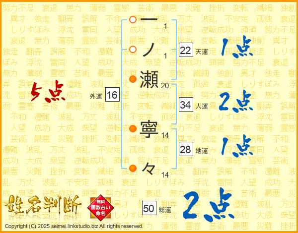 一(1画)ノ(1画)瀬(20画) 寧(14画)々(14画)