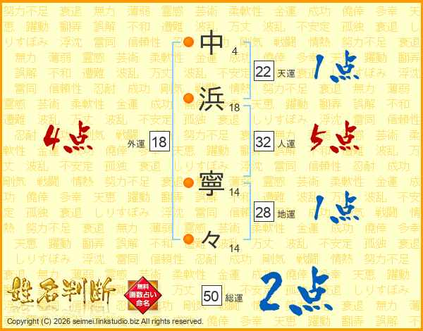 生活面を象徴する運勢です。外部から受ける影響力を表し、結婚運、家庭運や職場、環境への順応性を表します。総運から人運を引いた画数。姓や名が1文字の場合を除く。