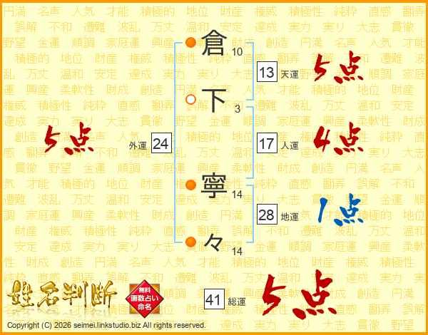 生活面を象徴する運勢です。外部から受ける影響力を表し、結婚運、家庭運や職場、環境への順応性を表します。総運から人運を引いた画数。姓や名が1文字の場合を除く。