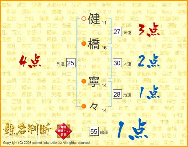 あなたの人生を表す1番重要な運勢です。生涯を通じて影響する総合運となり、主に50歳以降の晩年期に影響を及ぼします。苗字と名前の合計画数。