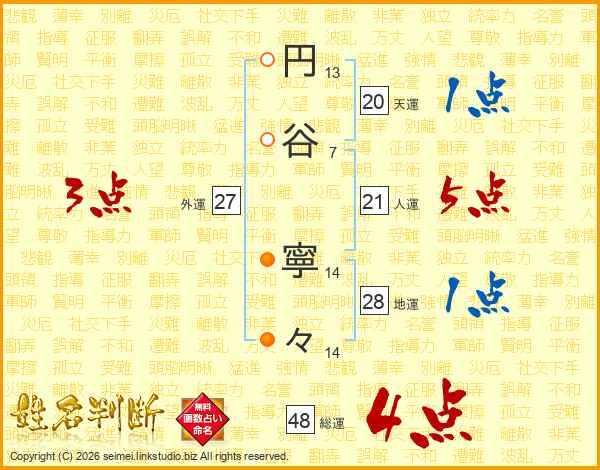 生活面を象徴する運勢です。外部から受ける影響力を表し、結婚運、家庭運や職場、環境への順応性を表します。総運から人運を引いた画数。姓や名が1文字の場合を除く。