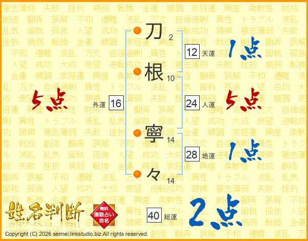 生活面を象徴する運勢です。外部から受ける影響力を表し、結婚運、家庭運や職場、環境への順応性を表します。総運から人運を引いた画数。姓や名が1文字の場合を除く。