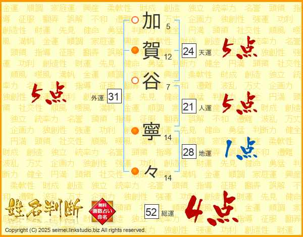 加賀谷寧々さんの総運は52画の4点!