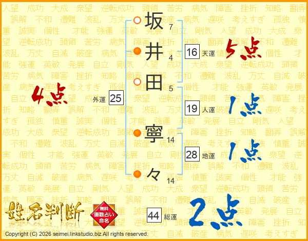 坂(7画)井(4画)田(5画) 寧(14画)々(14画)