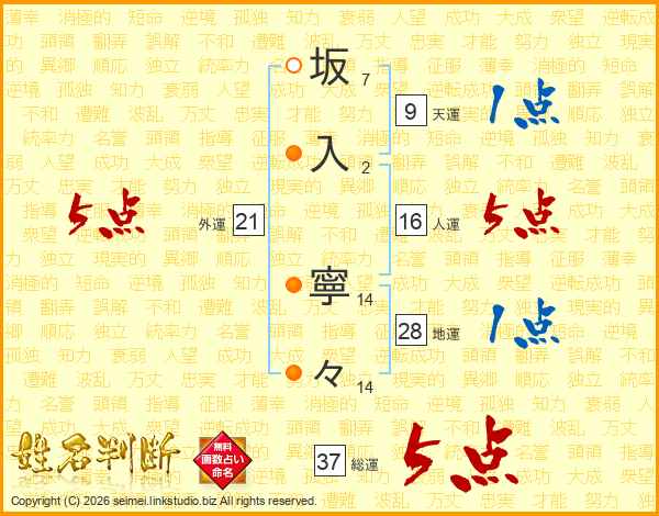 坂(7画)入(2画) 寧(14画)々(14画)