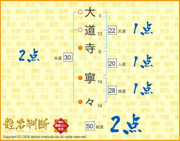生活面を象徴する運勢です。外部から受ける影響力を表し、結婚運、家庭運や職場、環境への順応性を表します。総運から人運を引いた画数。姓や名が1文字の場合を除く。