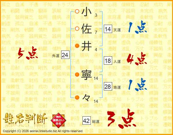 小(3画)佐(7画)井(4画) 寧(14画)々(14画)